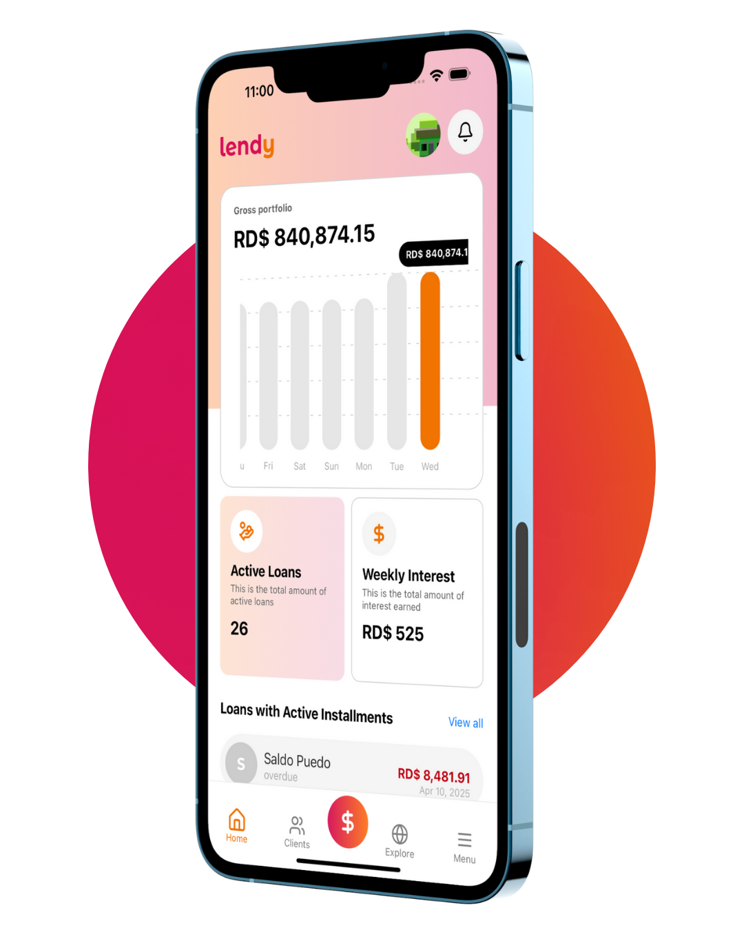 Desde la app puedes ver el tamaño de tu cartera, el crecimiento, pagos al día, préstamos vencidos, cuotas activas y mucho más. Todo en orden, todo en Lendy.